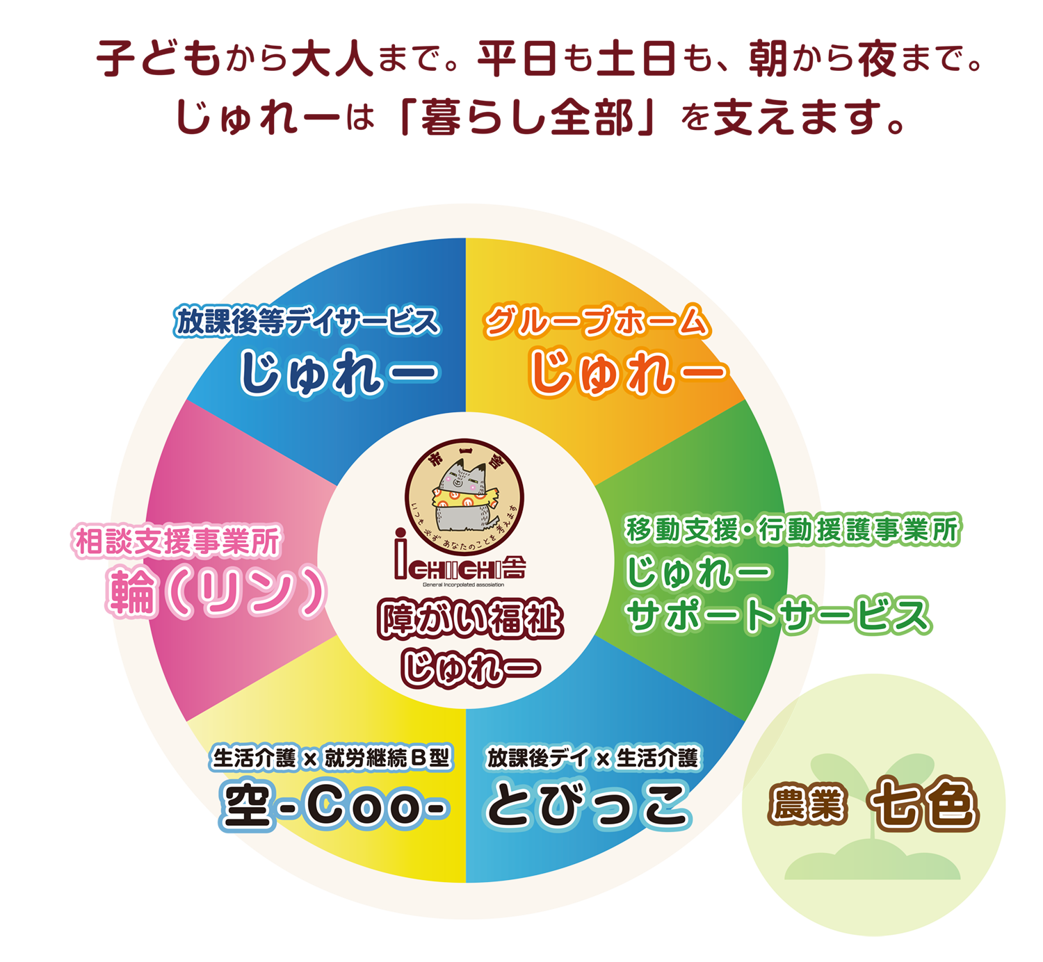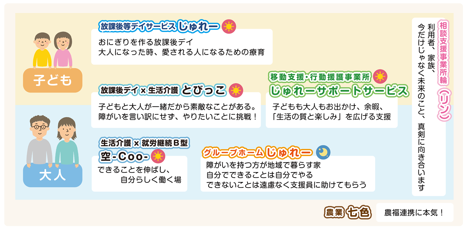 グループホーム、行動援護・移動支援事業所、放課後等デイ、生活介護事業所、多機能型事業所を運営しております。