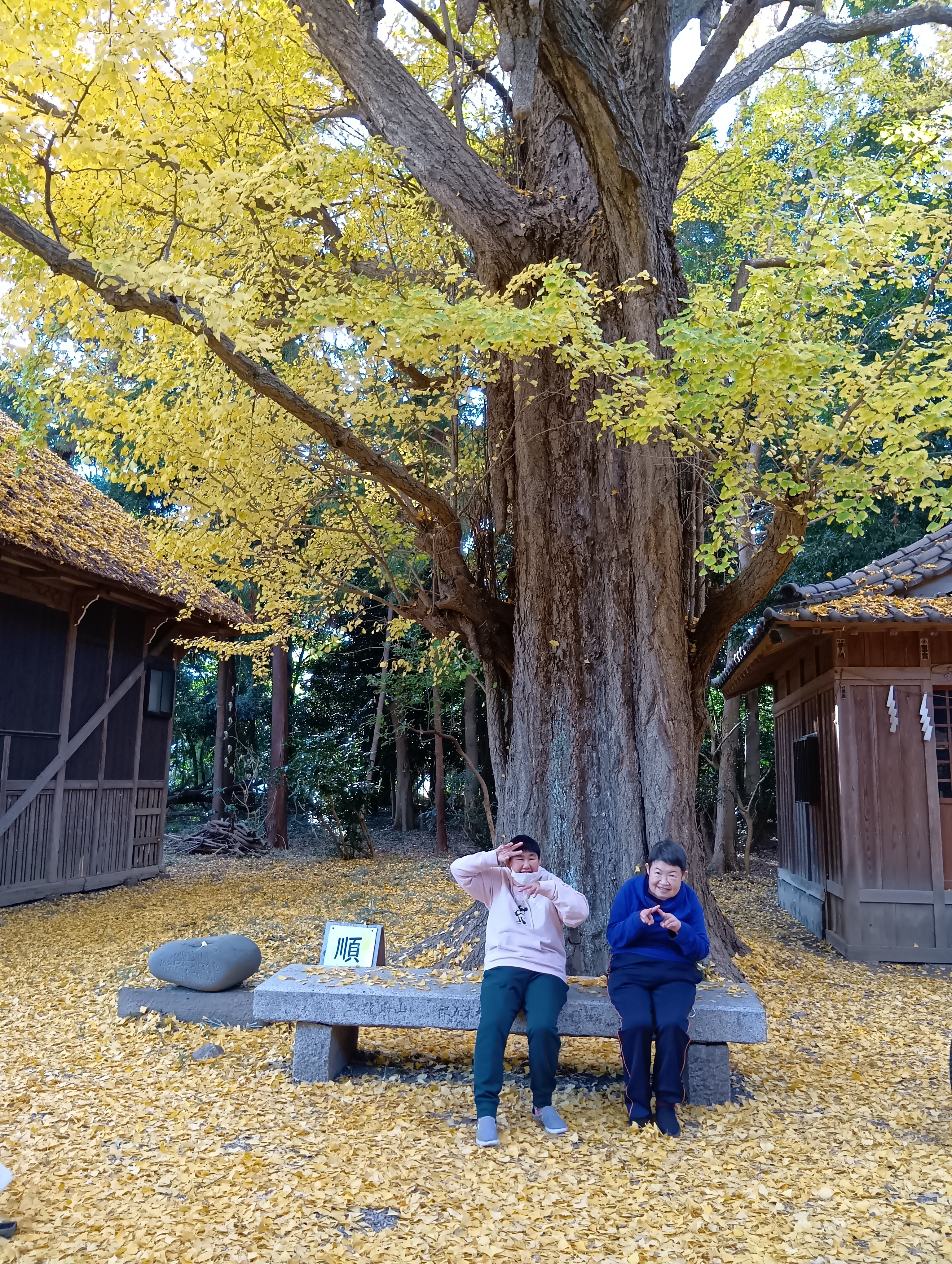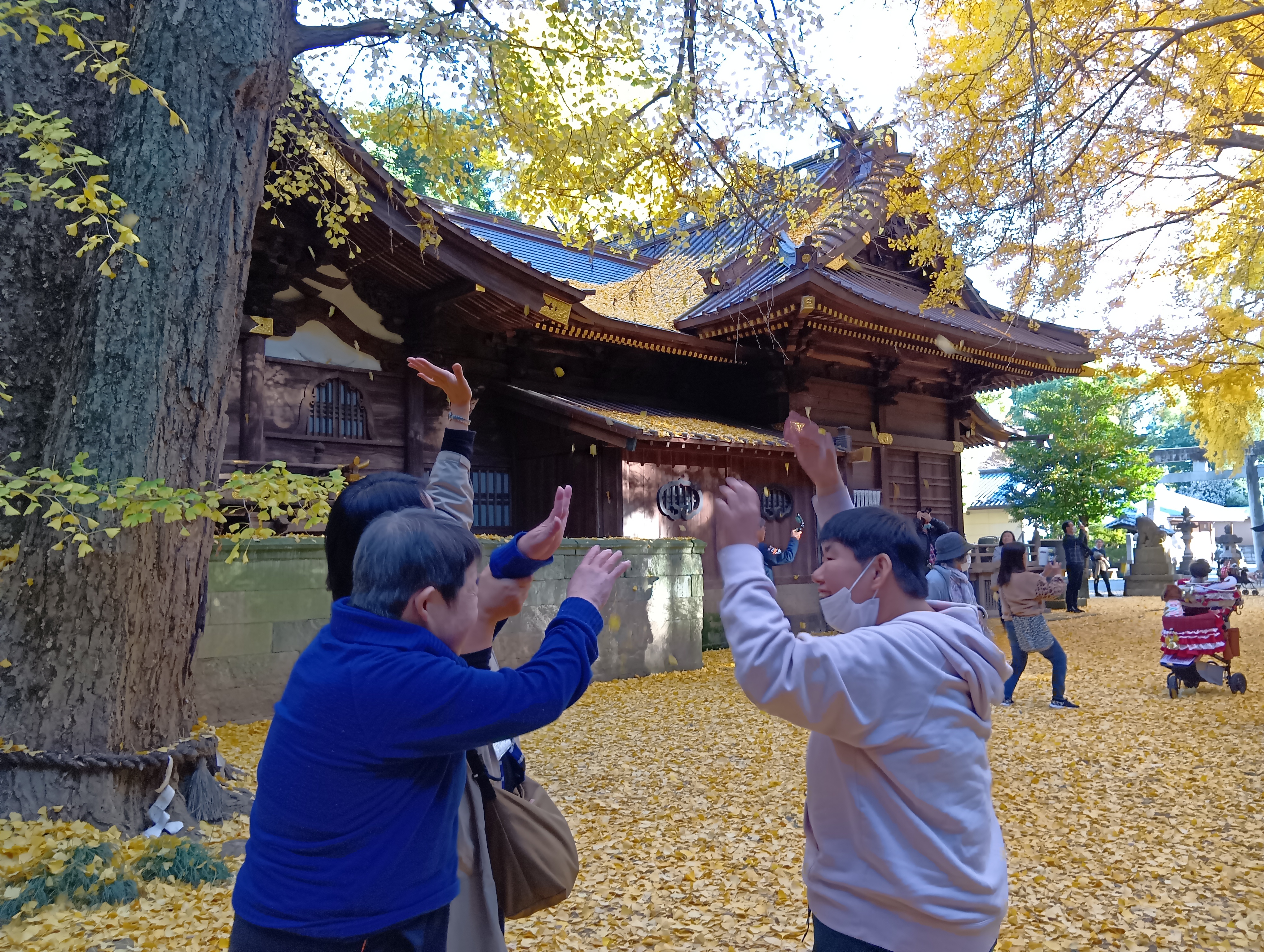 HOME > 2025年11月 > 2025年11月 活動報告玉敷神社 2025年11月22日 本日は、加須市の玉敷神社に行ってきました(⌒∇⌒)玉敷神社の境内でひときわ存在感を放っているのが2本の大イチョウ。どちらも樹齢500年ほどと伝えられ、長い年月をこの地で見守ってきた御神木とのことです。特に秋の黄葉は見事で、黄金色の葉が境内をふんわりと染める姿に、足を止めて見入っていました。イチョウのじゅうたんを広げたような光景が広がっていました。 Twitter Share Pocket Hatena LINE